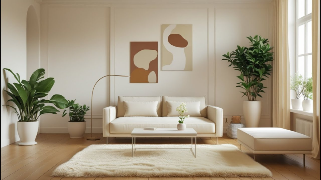 - Simple bases: Neutral walls, understated furniture, and open spaces